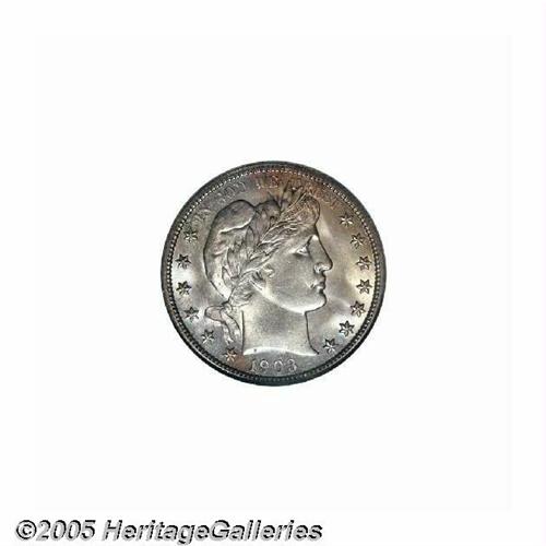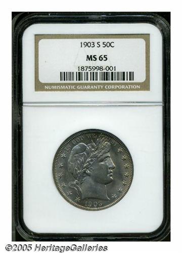 <B>1903-S<50C> MS65 NGC.</B></I> This is a brilliant Mint State example of this elusive issue. Walter Breen stated that "part of the demand for this date has been influenced by the fame of the dollar, quarter, and dime." The rest of the demand for this date has been influenced by its low survival rate in high grades. Only 11 Gem examples have been certified by the major grading services, five by PCGS and six by NGC. This example is sharply struck with brilliant and satiny silver luster, graced by faint champagne and powder-blue toning. Diagonal roller marks are noted over each side.