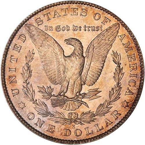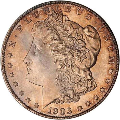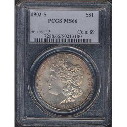 <b>1903-S Morgan Dollar. PCGS graded MS66.</b> There is a contrast between the similarly dated O-mint issue, and the 1903-S (1.2 million pieces produced), in that the 1903-S is a common issue in worn grades, but very scarce, some might say a condition rarity, in Mint State. According to Q. David Bowers writing in 1993 in his silver dollar encyclopedia, this S-mint issue was not represented in large quantity in any of the silver dollar hoards from the San Francisco Mint or LaVere Redfield. The surfaces of this champagne-gold to dusky gray toned example combine characteristics of both satin and frosty luster, although the former dominates by way of bold cartwheel effects. Sharply struck and nearly pristine, we anticipate sizable bidder clashes when this coin reaches the auction block.