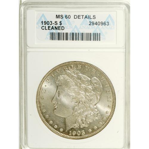 <B>1903-S S$1 --Cleaned--ANACS. MS60 Details.</B></I> Whispers of light gold-tan patina hug the margins of this semi-key date in the Morgan dollar series. The design elements are well defined, and lustrous surfaces reveal just a few inoffensive contact marks. Under high magnification, some faint hairlines are seen on Liberty's chin and in the left obverse field. Despite the "Cleaned" designation, this is a nice, respectable coin that will fit comfortably in a high-grade Morgan dollar set.<BR><BR><b>Shipping:</b> Coins & Currency (<a target="_blank" href="http://www.heritageauctions.com/common/shipping.php">view shipping information</a>)
