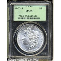 <B>1903-S<S$1> MS63 PCGS.</B></I> A brilliant and booming rare date Dollar that features a meticulous strike. The reverse is well preserved, and the obverse is also clean for the grade despite the occasional unimportant luster graze. A lovely older holder example. The 1903-S has the lowest mintage of any 20th century Morgan Dollar issue, and only the conditionally rare 1901 is tougher to locate in Mint State. <BR><BR><B>Important notice:</B> Heritage usually auctions material at the rate of 200-250 lots per hour. On some occasions eBay Live bid software or the Internet may not be able to keep up with the pace of the auction. We recommend placing a realistic absentee bid now as insurance to avoid disappointment. Occasionally the auctioneer may eliminate or reject an eBay Live bid, and the auctioneer may also reopen a lot after the close of the eBay live bidding (usually because we missed an audience bid), and may reject your bid even if it shows you as the winning bidder. By bidding via eBay Live, you agree that Heritage may award the lot to another bidder at its sole discretion under the circumstances described above or any other reasonable circumstances. Since eBay bids are not shown to us until we open the lot on the floor, we treat those bids just like floor bids. In most cases the floor responds before the eBay bid is presented to us, due to Internet lag time, so for consistency we have made it a policy that floor bids are always considered first over tie eBay live bids. Also please note that all Heritage lots purchased through eBay Live carry a 20% Buyer's Premium. Please make sure you read the Terms and Conditions before you bid. </span></font></tr></table></td></tr></table>