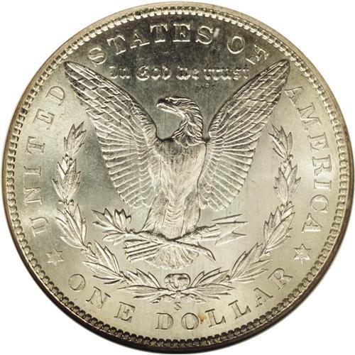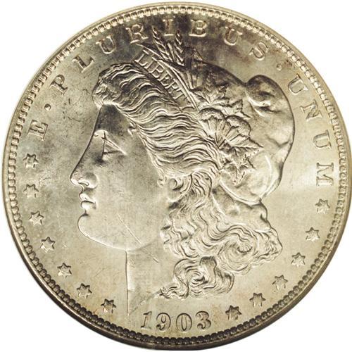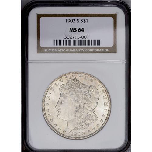 <B>1903-S<img border='0' src='http://www.heritagecoins.com/images/star.gif' width=10 height=10>$1> MS64 NGC.</B></I> This lustrous and suitably struck near-Gem is gently toned in chestnut and steel-blue. A single diagonal mark on the jaw denies an even higher grade. The 1903-S is even tougher than suggested by its mintage of 1.241 million pieces. Survivors are scarce throughout all grades. Perhaps the 1903-S, along with other difficult S-mint issues from the decade, contributed to the Pittman Act meltings.