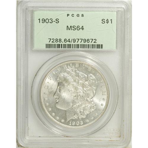 <B>1903-S S$1 MS64 PCGS.</B></I> A scarce and highly respected semi-key dollar, the 1903-S is very elusive in all grades of Mint State, and especially so in Choice or better condition. This piece is well struck and brilliant with only minor luster grazes to account for the grade, and those are mostly limited to the obverse. Roller marks (as struck) cross over Liberty's ear and chin.<BR><BR><b>Shipping:</b> Coin/Currency (<a target="_blank" href="http://www.heritageauctions.com/common/shipping.php">view shipping information</a>)