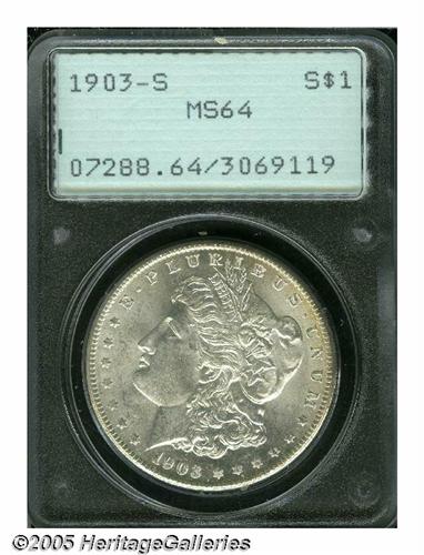 <B>1903-S<S$1> MS64 PCGS.</B></I> Light gold color visits this highly lustrous and meticulously struck San Francisco Silver Dollar. The reverse is especially well preserved. Although any S-mint issue between 1898 and 1904 is a much better date, the 1903-S is particularly scarce, probably due to its low mintage of 1,241,000 pieces. Certified in a first generation holder.<BR><I>From The Dr. John L. Pellegrini Collection.</B></I>