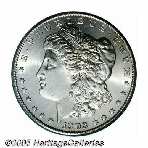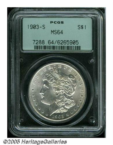 <B>1903-S<S$1> MS64 PCGS.</B></I> The 1903-S has a limited mintage for the series of just over 1.2 million pieces and a relatively small percentage escaped both the ravages of Western commerce and the mass meltings of the Pittman Act. The typical Mint State survivor, like this coin, is carefully produced with strong central details and a vibrant, satiny glow. The eye appeal is further enhanced by the coin's snow-white appearance overall.