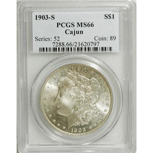 <B>1903-S S$1 MS66 PCGS.</B></I> Ex: Cajun. VAM-4. Like several varieties of the 1903-S Morgan dollars, this piece is from a doubled reverse die created by use of two different hubs. An extra olive is clearly visible next to the primary bud, and other minor doubling is also apparent. While such varieties are generally not all that popular with collectors today, they certainly lend additional numismatic interest. This piece is a lovely Premium Gem with soft, frosty luster and brilliant silver surfaces. Slight traces of pale champagne toning are evident on each side, and the surfaces are free of blemishes. Population: 33 in 66, 3 finer (2/07).<BR><I>From The Jackson Hole Collection.</B></I><BR><BR><b>Shipping:</b> Coins & Currency (<a target="_blank" href="http://www.heritageauctions.com/common/shipping.php">view shipping information</a>)