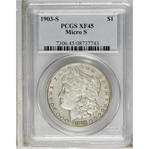 <B>1903-S<img border='0' src='http://www.heritagecoins.com/images/star.gif' width=10 height=10>$1> Micro S XF45 PCGS.</B></I> VAM-2. A Top 100 Variety. Specialists believe that a mintmark punch intended for Barber quarters was used to create this popular variety. PCGS refers to it as a Micro S, while the Top 100 authors call it a Small S. By either name, it is only about half the size of the normal Large S. The present problem-free piece offers ample remaining luster, and the silver-gray and chestnut surfaces are unblemished. Population: 18 in 45, 8 finer (9/06).