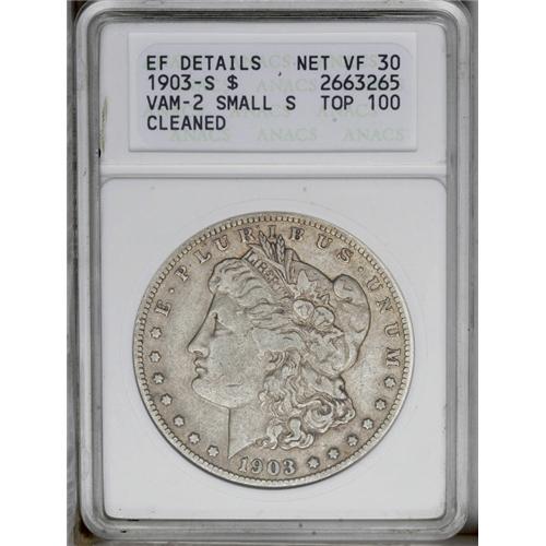 <B>1903-S<img border='0' src='http://www.heritagecoins.com/images/star.gif' width=10 height=10>$1> Small S--Cleaned--ANACS. XF Details, Net VF30.</B></I> VAM-2. A Top 100 Variety. A thickly hairlined dove-gray example of this desirable VAM variety. A minor rim ding is noted at 1 o'clock on the reverse.