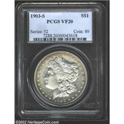 1903-S S$1 VF20 PCGS. The obverse has a peripheral band of golden-brown color, while the reverse is untoned. Surprisingly detailed for the grade, with faint slide marks visible on each side. A scarce date. Important notice: We expect to be auctioning lots at the rate of 200-250 per hour. Sometimes eBay Premier live bid software cannot keep up with that pace, so we strongly recommend that you place a realistic proxy bid now as insurance to avoid disappointment. Also please note that all Heritage/CAA lots purchased through eBay Premier carry a 20% Buyer's Premium. Please make sure you read the Terms and Conditions.
