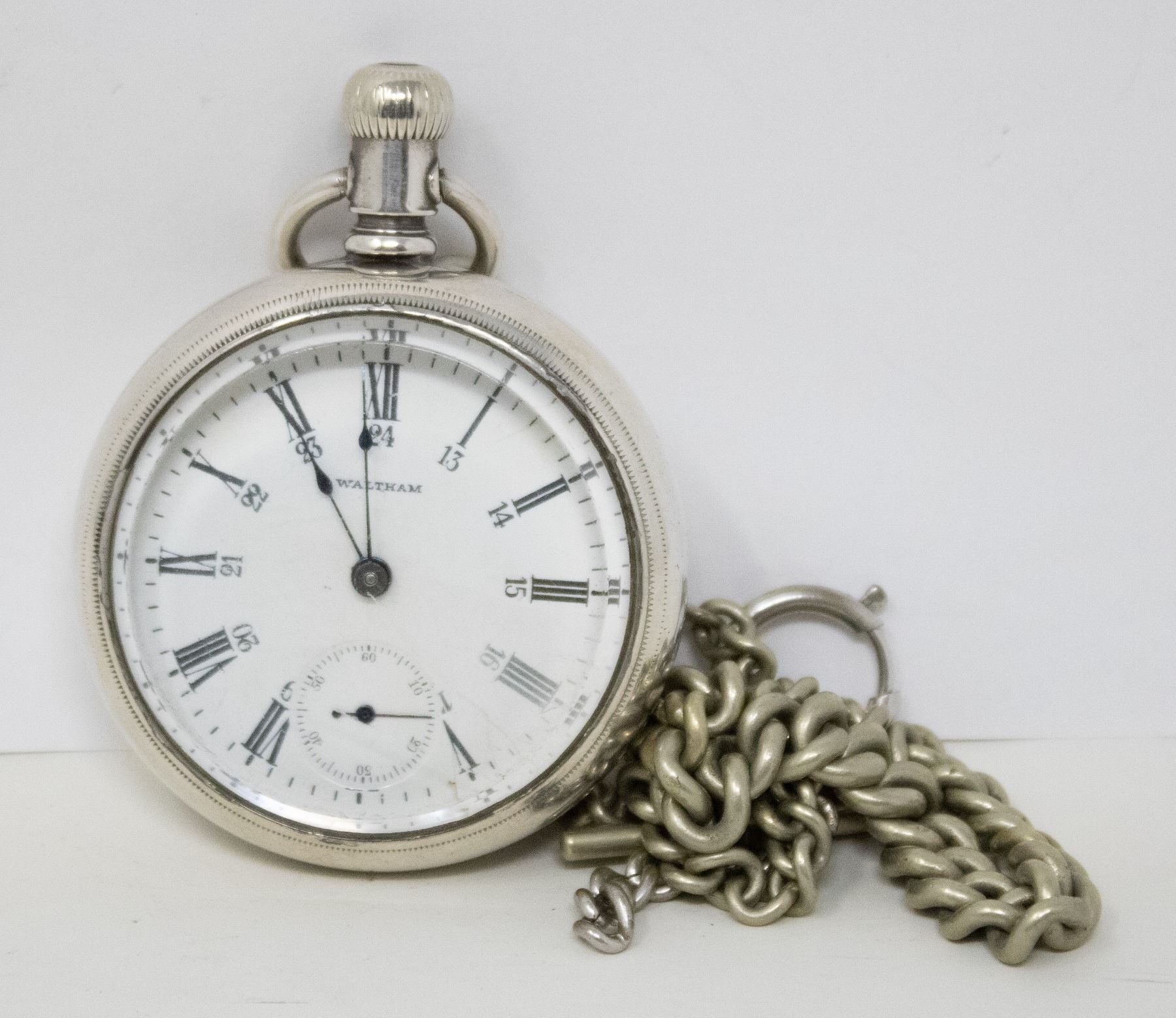 1903 WALTHAM SILVER CASE WATCH W CHAIN WORKS