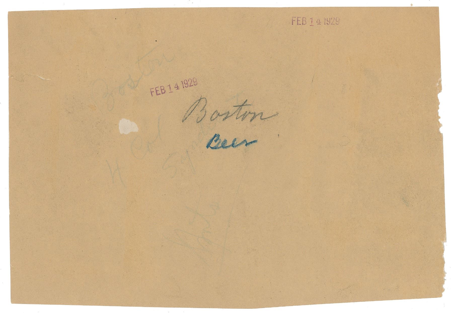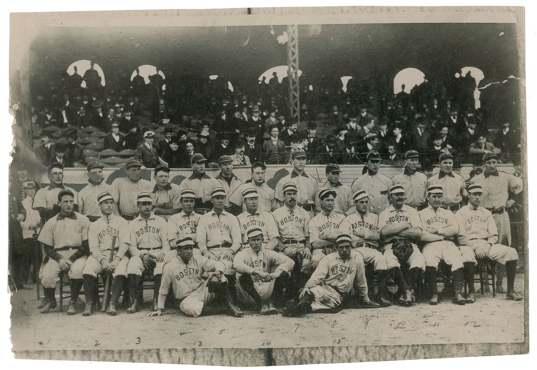 Vintage circa 1929 semi-glossy 11.25 x 7.75 silver gelatin press photo of the Pittsburgh Pirates and Boston Red Sox teams during the first-ever World Series in 1903, highlighted by the presence of Honus Wagner for Pittsburgh and Cy Young for Boston. Reverse is stamp-dated February 14, 1929. In very good condition, with editorial touch-ups to image, creasing, trimmed edges, loss along the left edge, and an inch-long tear to the right edge.