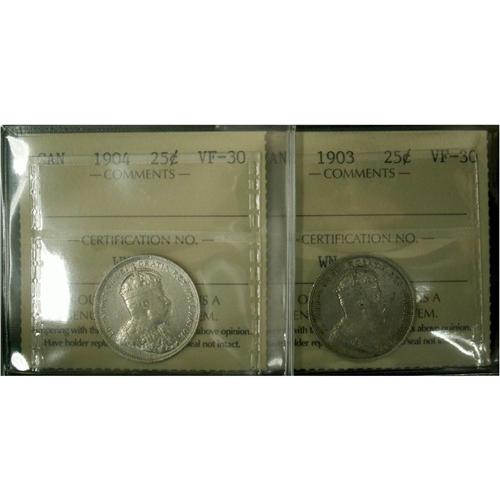 1903 and 1904 25¢. Lot of 2 ICCS VF30 coins.
