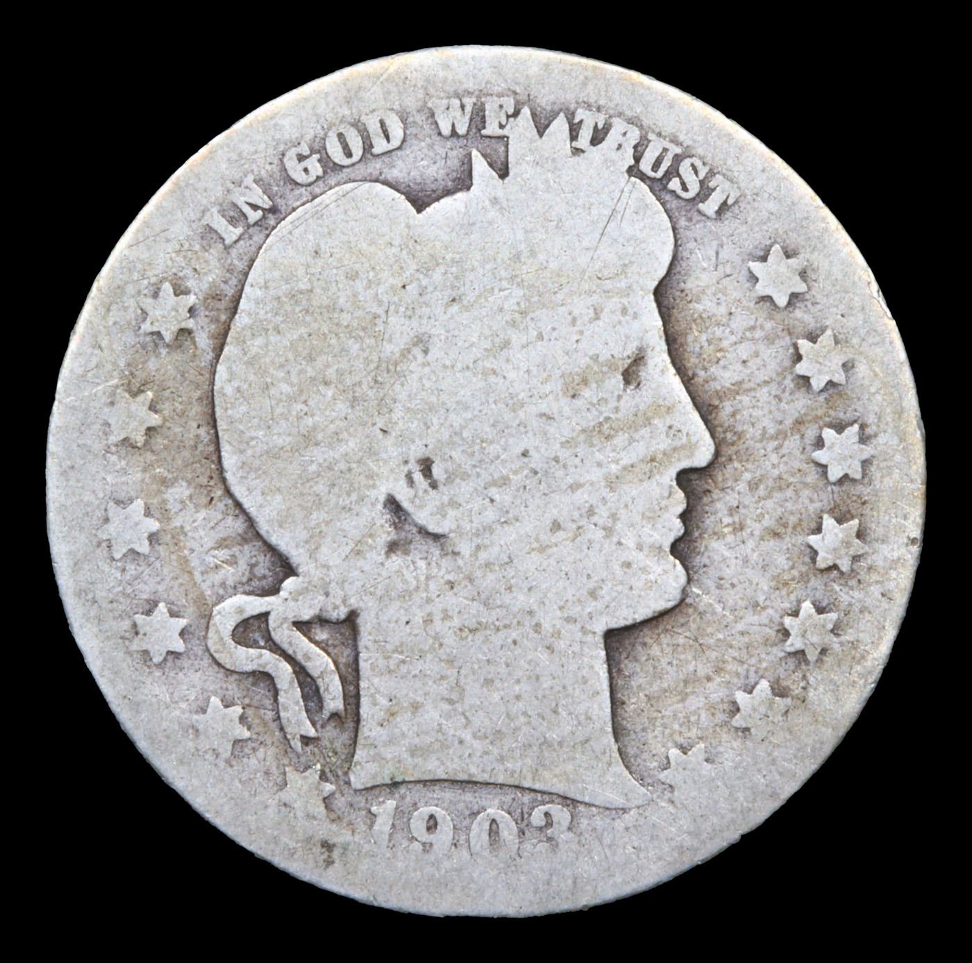 1903-o Barber Quarter 25c Grades g, good. One of the Most Undervalued coins in the entire Barber Series, per David Lawrence in his Book "The Complete Guide to barber Quarters" Quoting him "this date is very underrated in nice AU and above"
