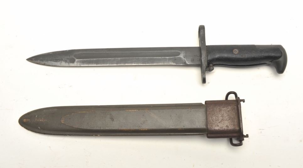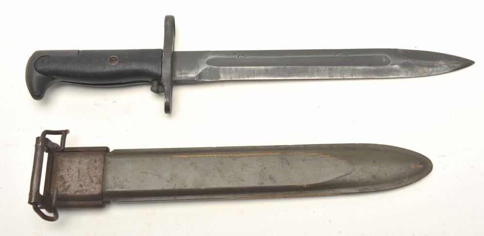 clipped point by Utica Cutlery from WWII. Very good blade and grips. Good scabbard. Est.: $75-$150