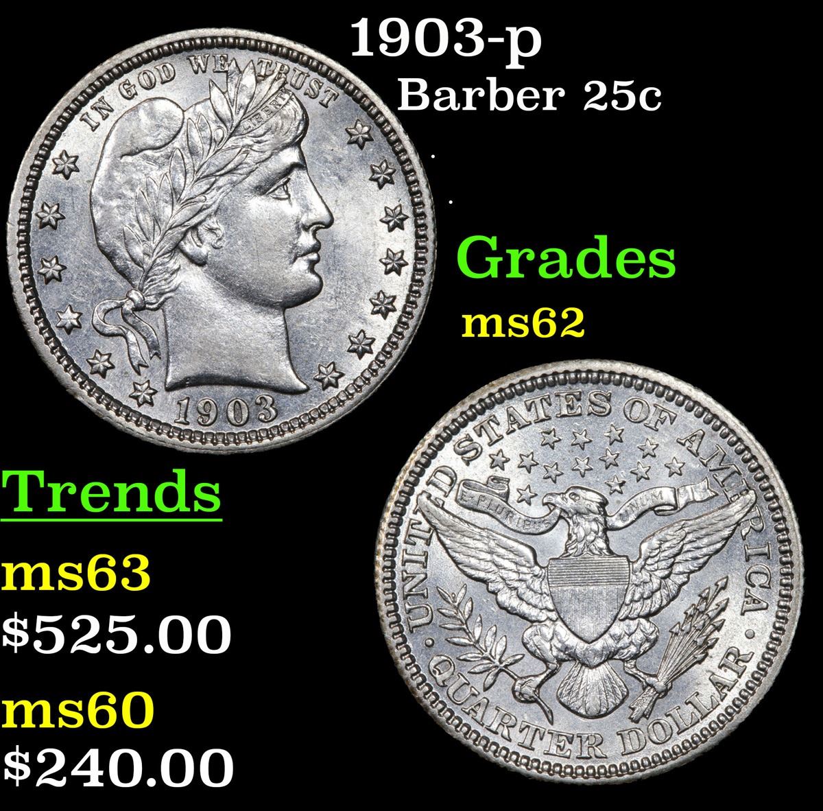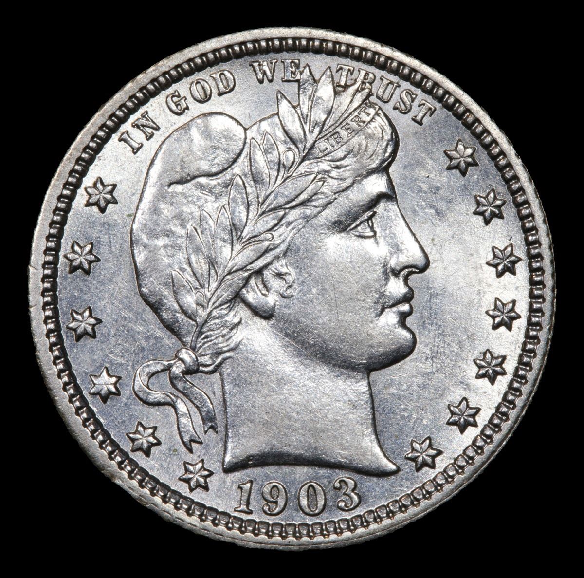 1903-p . . Barber Quarter 25c Grades Select Unc. According to David Lawrence's' book "The Complete Guide to Barber Quarters" he says "this date (The 1903-p) is greatly undervalued in all mint state grades."