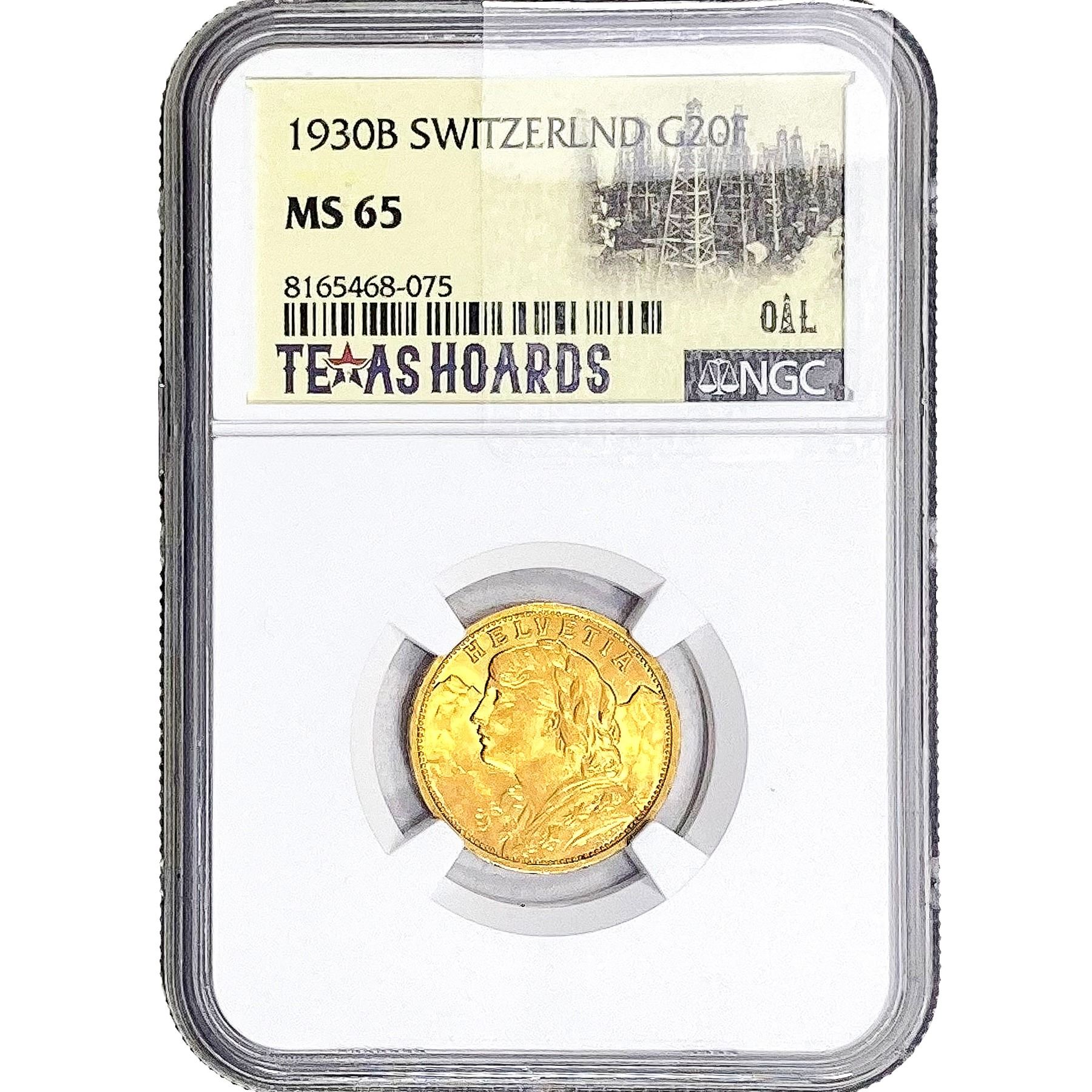 1903B Switzerland .1867 OZ Gold 20 Francs NGC MS65