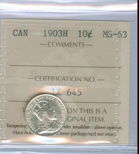 1903H 10¢ ICCS MS63, a nice brilliant and lustrous example.