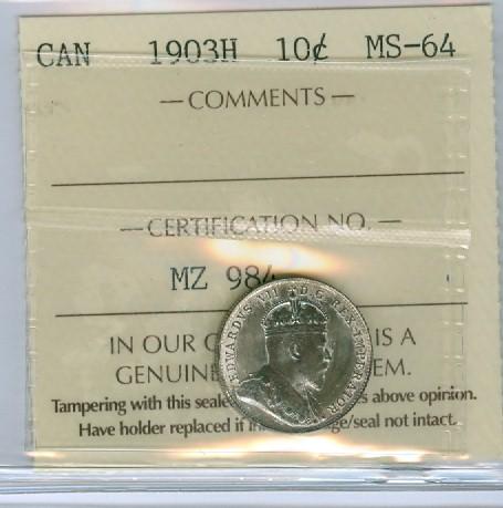 1903H 10¢ ICCS MS64. Funny look yet quite attractive. Should be viewed.