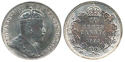 1903H 10¢ ICCS MS64. Strong lustre under blue and gred tints.