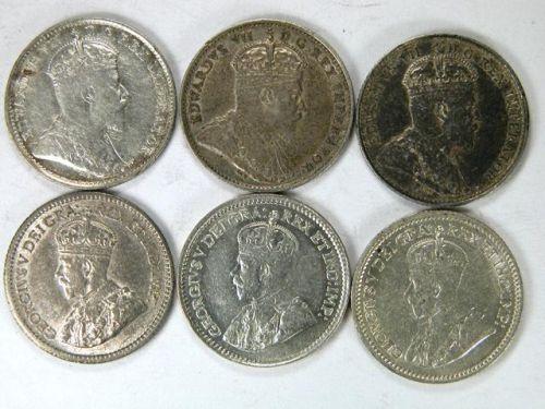 Canada Five Cents 1903H, 1908 Small 8, 1909 Round Leaves, 1912, 1914 and 1917, all EF, pale to lightly toned