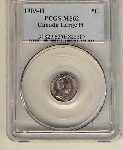1903H 5¢ LG H PCGS MS62. Lustrous with light golden tint.
