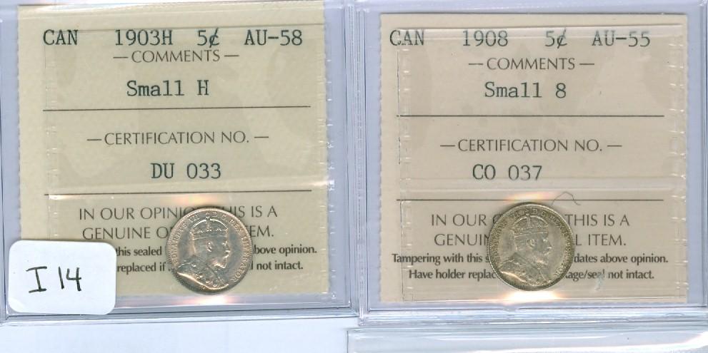 1903H 5¢ Sml H & 1908 Sml 8 . Lot of two ICCS coins AU58 and AU55 respectively.
