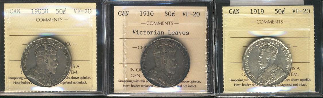 1903H 50¢, 1910 VL & 1919 ICCS VF20. Lot of 3 coins.