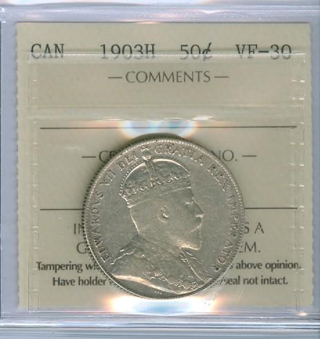 1903H 50¢ ICCS VF30. White with remaining lustre.