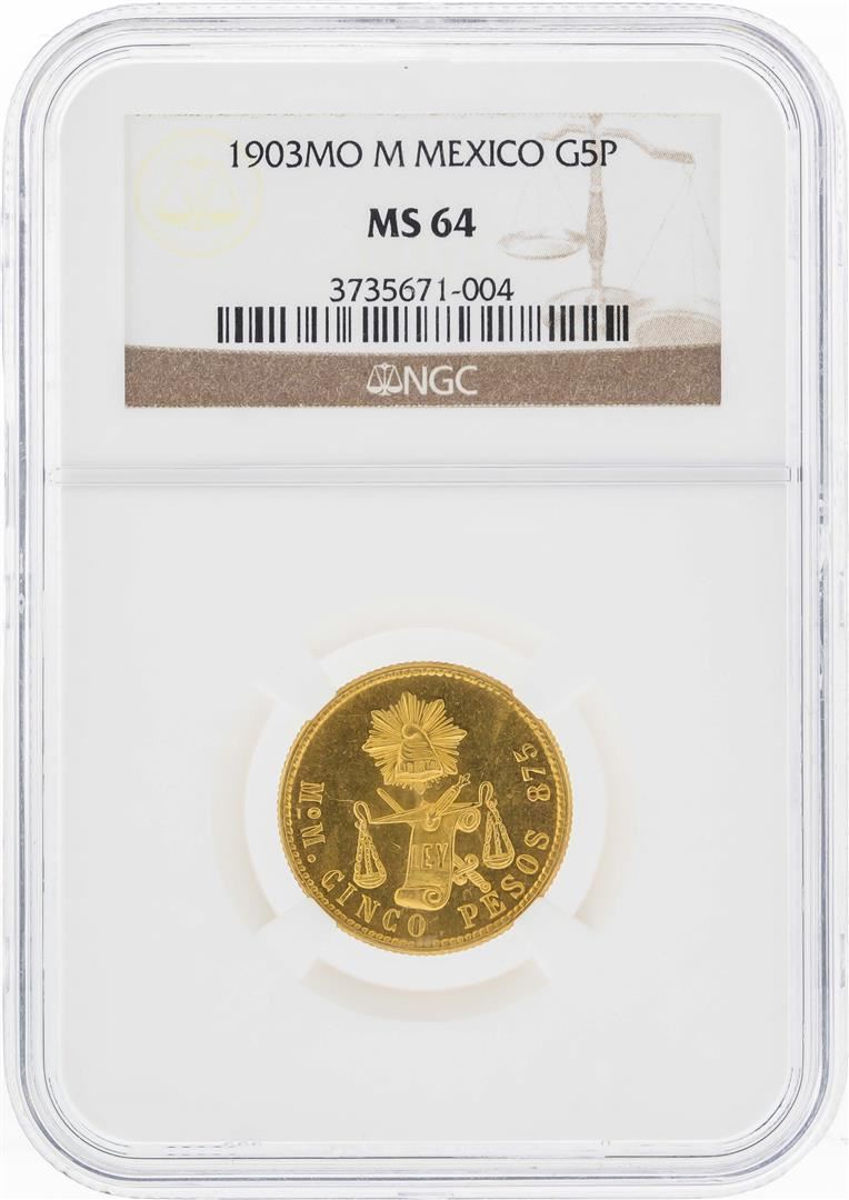 One 1903MO M Mexico 5 Pesos Gold Coin NGC MS64. NGC Certified.