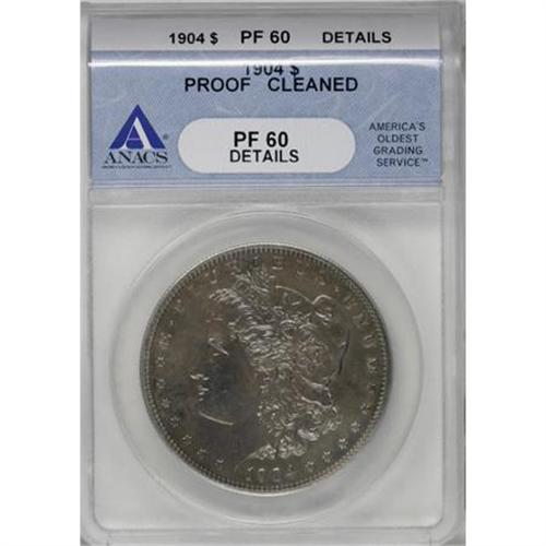 <B>1904 $1 --Cleaned--ANACS. PR60 Details.</B></I> Both sides show strong detail and luminous mirrors despite a past cleaning. The lightly hairlined surfaces show blue-inflected russet and lemon-orange shadings.<BR><BR><B>Coin Engraver:</B> George T. Morgan<BR><BR><b>Shipping:</b> Coins & Currency (<a target="_blank" href="http://www.heritageauctions.com/common/shipping.php">view shipping information</a>)