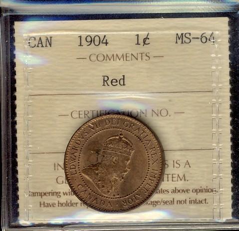 1904 1¢ ICCS MS64RD. 95% red and lustrous.