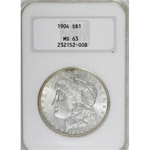 <B>1904 $1 MS63 NGC.</B></I> Peach and forest-green cling to the peripheries of this sharply struck Select silver dollar. Unusually clean for the grade aside from a solitary slide mark on the cheek. Certified in an older generation holder.<BR><BR><B>Coin Engraver:</B> George T. Morgan<BR><BR><b>Shipping:</b> Coins & Currency (<a target="_blank" href="http://www.heritageauctions.com/common/shipping.php">view shipping information</a>)