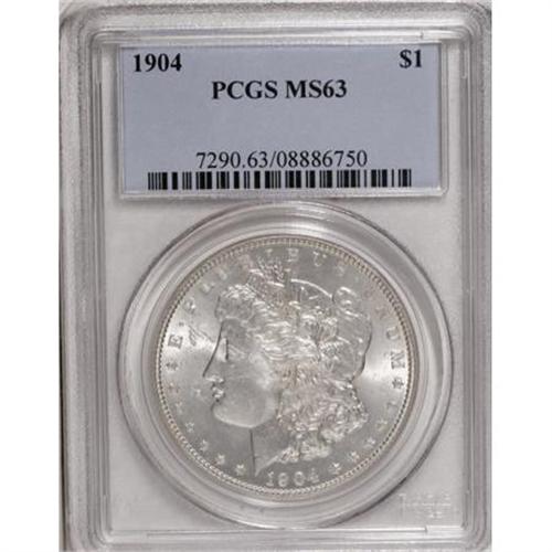 <B>1904 $1 MS63 PCGS.</B></I> PCGS Population (1248/1173). NGC Census: (988/870). Mintage: 2,788,650. Numismedia Wsl. Price for NGC/PCGS coin in MS63: $220. (#7290)<BR><BR><B>Coin Engraver:</B> George T. Morgan<BR><BR><b>Shipping:</b> Coins & Currency (<a target="_blank" href="http://www.heritageauctions.com/common/shipping.php">view shipping information</a>)