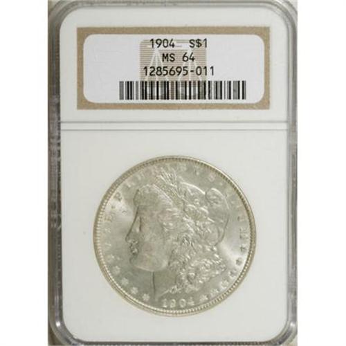 <B>1904 $1 MS64 NGC.</B></I> A lovely near-Gem representative of this late-date issue, solidly struck with elegant eye appeal. Subtle silver-gray shadings rest over generally cream-tinted surfaces.<BR><BR><B>Coin Engraver:</B> George T. Morgan<BR><BR><b>Shipping:</b> Coins & Currency (<a target="_blank" href="http://www.heritageauctions.com/common/shipping.php">view shipping information</a>)