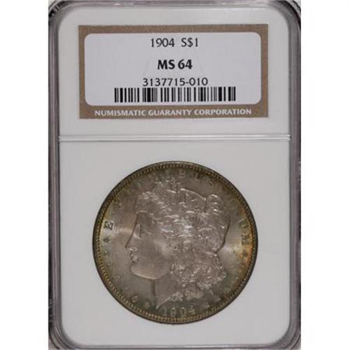 <B>1904 $1 MS64 NGC.</B></I> The obverse of this Choice coin has swirling, satiny luster beneath silver-blue patina that shows elements of gold-orange near the rim. The reverse offers similar coloration, but with areas of violet and orange close to the center.<BR><BR><B>Coin Engraver:</B> George T. Morgan<BR><BR><b>Shipping:</b> Coins & Currency (<a target="_blank" href="http://www.heritageauctions.com/common/shipping.php">view shipping information</a>)