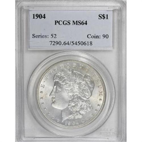 <B>1904 $1 MS64 PCGS.</B></I> PCGS Population (983/170). NGC Census: (787/83). Mintage: 2,788,650. Numismedia Wsl. Price for NGC/PCGS coin in MS64: $550. (#7290)<BR><BR><B>Coin Engraver:</B> George T. Morgan<BR><BR><b>Shipping:</b> Coins & Currency (<a target="_blank" href="http://www.heritageauctions.com/common/shipping.php">view shipping information</a>)