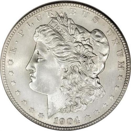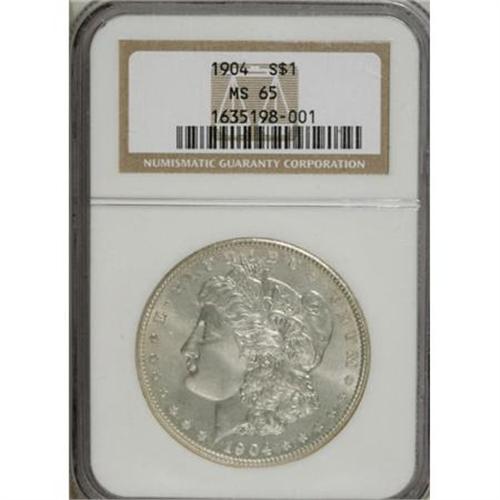 <B>1904 $1 MS65 NGC.</B></I> Business strike 1904 dollars are very scarce in MS65, and rare any finer. Speckles of light gold color travel over the obverse of the current Gem, and the same color blankets the reverse. A well executed strike brings out sharp detail on the design features, and the surfaces of both sides are impeccably preserved. Census: 78 in 65, 5 finer (12/07).<BR><I>From The Motor City Collection.</B></I><BR><BR><B>Coin Engraver:</B> George T. Morgan<BR><BR><b>Shipping:</b> Coins & Currency (<a target="_blank" href="http://www.heritageauctions.com/common/shipping.php">view shipping information</a>)