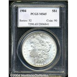<table><tbody><tr><td><table> <TR><TD width="100%"><TABLE cellSpacing=1 cellPadding=3 width="100%" border=0><TBODY><TR><TD width="100%" bgColor=#79735c><FONT face=arial color=#ffffff size=3><B>Description</B> </FONT></TD></TR><TR><TD width="100%" bgColor=#ffffff><FONT face=arial size=2><B>1904 $1 MS65 PCGS.</B></I> This lustrous Gem is noticeably free of any distracting abrasions, especially on the often marred cheek of Liberty, and is a highly lustrous example for the grade. It is fully brilliant, and has the eye appeal of an even higher grade. Well struck Gems are conditionally scarce, as is evidenced by the population figures from the certification services. Only 12 pieces have been graded any finer by the two major services combined. Population: 103 in 65, 9 finer (10/03). </FONT></TD></TR></TBODY></TABLE></TD></TR></TBODY></TABLE><BR><A name=PricesRealized></A><TABLE cellSpacing=0 cellPadding=0 width="100%" bgColor=#000000 border=0><TBODY><TR><TD width="100%"><TABLE cellSpacing=1 cellPadding=3 width="100%" border=0><TBODY><TR><TD width="100%" bgColor=#79735c><A name=PR><FONT face=arial color=#ffffff size=3><B>Previous Prices from Heritage Auctions</B> </FONT></A></TD></TR><TR><TD bgColor=#f6f6ed><TABLE cellSpacing=0 cellPadding=0 width="100%" border=1><TBODY><TR><TD align=middle width="33%"><B>Date</B></TD><TD align=middle width="33%"><B>Service</B></TD><TD align=middle width="33%"><B>Price</B></TD></TR><TR bgColor=whitesmoke><TD width="33%"><B>11/05/2002</B></TD><TD width="33%">NGC</TD><TD width="33%">$2,530.00</TD></TR><TR bgColor=whitesmoke><TD width="33%"><B>01/25/2000</B></TD><TD width="33%">NGC</TD><TD width="33%">$2,500.00</TD></TR><TR bgColor=whitesmoke><TD width="33%"><B>01/11/2003</B></TD><TD width="33%">PCGS</TD><TD width="33%">$3,680.00</TD></TR><TR bgColor=whitesmoke><TD width="33%"><B>11/15/2001</B></TD><TD width="33%">PCGS</TD><TD width="33%">$4,140.00</TD></TR><TR bgColor=whitesmoke><TD width="33%"><B>08/08/2001</B></TD><TD width="33%">PCGS</TD><TD width="33%">$3,335.00</TD></TR><TR bgColor=whitesmoke><TD width="33%"><B>01/05/2001</B></TD><TD width="33%">PCGS</TD><TD width="33%">$4,485.00</TD></TR><TR bgColor=whitesmoke><TD width="33%"><B>05/05/2000</B></TD><TD width="33%">PCGS</TD><TD width="33%">$3,260.25</TD></TR><TR bgColor=whitesmoke><TD width="33%"><B>08/13/1999</B></TD><TD width="33%">PCGS</TD><TD width="33%">$3,450.00</TD></TR><TR bgColor=whitesmoke><TD width="33%"><B>06/04/1999</B></TD><TD width="33%">NGC</TD><TD width="33%">$3,162.50</TD></TR><TR bgColor=whitesmoke><TD width="33%"><B>01/06/1996</B></TD><TD width="33%">PCGS</TD><TD width="33%">$1,430.00</TD></TR><TR bgColor=whitesmoke><TD width="33%"><B>07/31/1993</B></TD><TD width="33%">PCGS</TD><TD width="33%">$2,310.00</TD></TR><TR bgColor=whitesmoke><TD width="33%"><B>02/01/2001</B></TD><TD width="33%">NGC</TD><TD width="33%">$1,955.00</TD></TR><TR bgColor=whitesmoke><TD width="33%"><B>02/01/1999</B></TD><TD width="33%">PCGS</TD><TD width="33%">$552.00</TD></TR><TR bgColor=whitesmoke><TD width="33%"><B>11/01/1998</B></TD><TD width="33%">PCGS</TD><TD width="33%">$4,140.00</TD></TR></TBODY></TABLE></TD></TR><TR><TD bgColor=#ffffff><FONT face=arial size=1 ?>PLEASE NOTE: All prices realized reflect the final hammer price PLUS the buyer's premium in auctions that charge a buyer's premium. Each item has a notation at the top of the listing indicating whether that lot included a buyer's premium. Example: A item that sells with a final hammer price of $100 and a 20% buyer's premium will display with a price realized of $120. All information listed is intended to be as accurate as possible, but errors are possible. Please use this guide carefully and inform us of any inaccuracies. </FONT></TD></TR></TBODY></TABLE></TD></TR></TBODY></TABLE><BR><TABLE cellSpacing=0 cellPadding=0 width="100%" bgColor=#000000 border=0><TBODY><TR><TD width="100%"><TABLE cellSpacing=1 cellPadding=3 width="100%" border=0><TBODY><TR><TD width="100%" bgColor=#79735c colSpan=6><FONT face=arial color=#ffffff size=3><B>Price Guide*</B> </FONT></TD></TR><TR bgColor=#f6f6ed><TD align=middle><B>Grade</B> </TD><TD align=middle><B>Coin World<BR>(Trends)</B> </TD><TD align=middle><B>Numismedia<BR>Retail</B> </TD><TD align=middle><B>Numismedia<BR>Wholesale</B> </TD><TD align=middle><B>Coin<BR>Universe</B> </TD><TD align=middle><B>Heritage<BR>Value Index</B> </TD></TR><TR bgColor=#ffffff><TD align=middle>64</TD><TD align=right>$550.00</TD><TD align=right>$565.00</TD><TD align=right>$452.00</TD><TD align=right>$600.00</TD><TD align=right>$410.13</TD></TR><TR style="FONT-WEIGHT: bold" bgColor=#cccfdd><TD align=middle>65</TD><TD align=right>$4,500.00</TD><TD align=right>---</TD><TD align=right>$3,450.00</TD><TD align=right>$4,800.00</TD><TD align=right>$3,289.50</TD></TR><TR bgColor=#ffffff><TD align=middle>66</TD><TD align=right>$9,000.00</TD><TD align=right>---</TD><TD align=right>$6,375.00</TD><TD align=right>$10,500.00</TD><TD align=right>$6,015.00</TD></TR><TR bgColor=#ffffff><TD colSpan=6><FONT size=1>*All information listed is intended to be as accurate as possible, but errors are possible. No item may be returned or refused based on this information which is provided as a service to our customers. You should contact each pricing source directly to determine the accuracy of this information. </FONT></TD></TR></TBODY></TABLE></TD></TR></TBODY></TABLE><BR><TABLE cellSpacing=0 cellPadding=0 width="100%" bgColor=#000000 border=0><TBODY><TR><TD width="100%"><TABLE cellSpacing=1 cellPadding=3 width="100%" border=0><TBODY><TR><TD width="100%" bgColor=#79735c><FONT face=arial color=#ffffff size=3><B>Population Guide</B> </FONT></TD></TR><TR bgColor=#ffffff><TD align=middle><!-- Begin Output of Population Grid--><TABLE cellSpacing=0 cellPadding=0 width="100%" border=0><TBODY><TR><TD vAlign=center><TABLE cellSpacing=0 width="100%" border=1 cellsadding="3"><TBODY><TR><TD vAlign=center><TABLE cellSpacing=0 cellPadding=3 width="100%" border=1><TBODY><TR><TD 