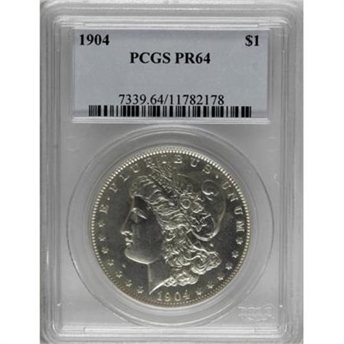 <B>1904 $1 PR64 PCGS.</B></I> Little contrast is noted on this proof Morgan dollar, the last of the regular P-mint issues, since the redesigned 1921 Morgans are a subtype within the series. The silver, chromelike surfaces are well mirrored and well struck, but the devices show no mint frost and there is no hint of color. One of a proof mintage of 650 pieces.<BR><BR><B>Coin Engraver:</B> George T. Morgan<BR><BR><b>Shipping:</b> Coins & Currency (<a target="_blank" href="http://www.heritageauctions.com/common/shipping.php">view shipping information</a>\)