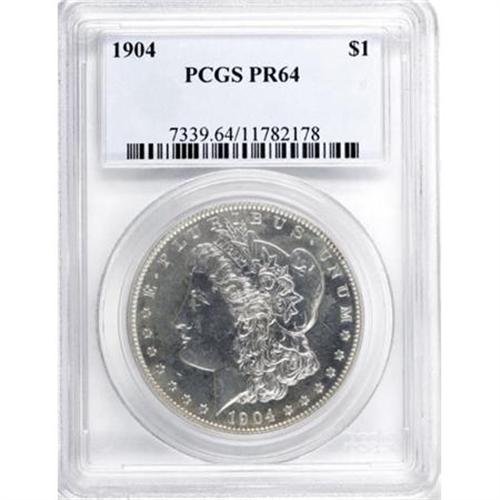 <B>1904 $1 PR64 PCGS.</B></I> A trace of contrast can be detected on this delightful proof Morgan dollar, the last issue of the continuous series that started in 1878. After these coins were produced, an intermission of well over a decade occurred before the design was revived for a short time in 1921. This brilliant near-Gem has a hint of champagne toning on otherwise bright silver surfaces.<BR><BR><B>Coin Engraver:</B> George T. Morgan<BR><BR><b>Shipping:</b> Coins & Currency (<a target="_blank" href="http://www.heritageauctions.com/common/shipping.php">view shipping information</a>)