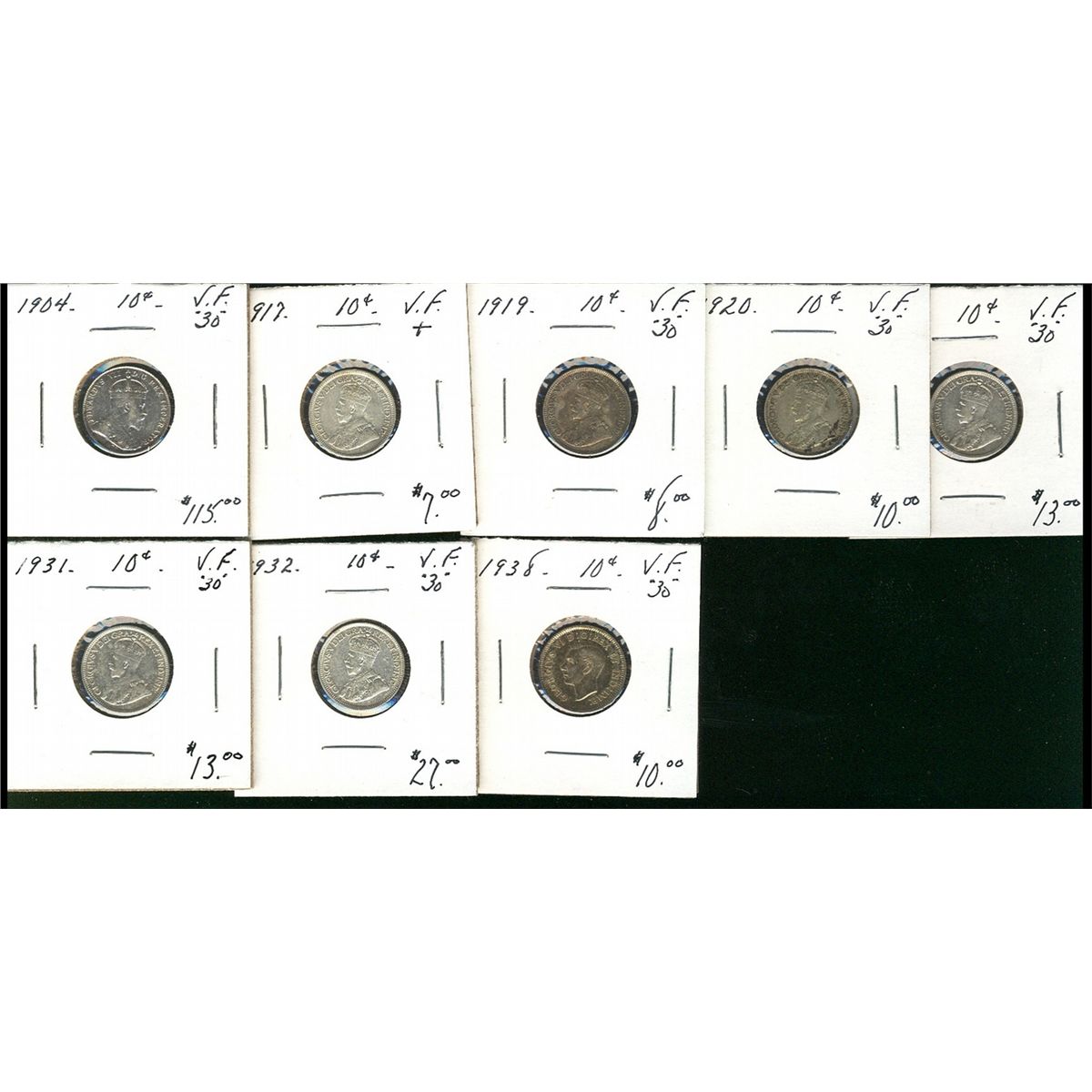 1904 10¢, 1917, 1919, 1920, 1929, 1931, 1932 & 1938. Lot of 8 coins all VF30. (PBA).