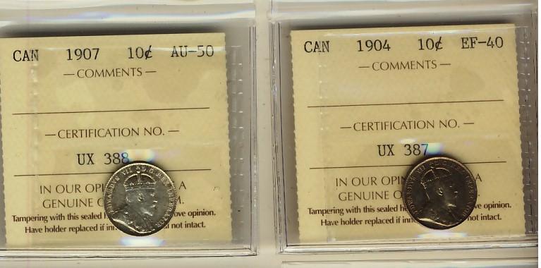 1904 10¢ EF40 & 1907 AU50. Lot of 2 ICCS graded coins.