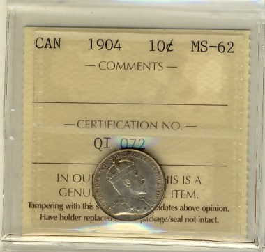 1904 10¢ ICCS MS62, lightly toned. A tough date.