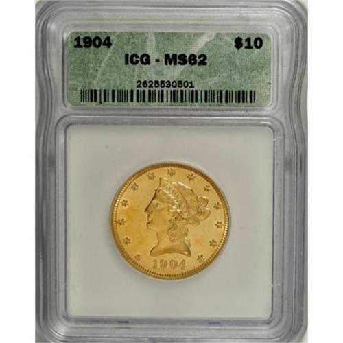 <B>1904 $10 MS62 ICG.</B></I> NGC Census: (225/111). PCGS Population (249/120). Mintage: 161,900. Numismedia Wsl. Price for NGC/PCGS coin in MS62: $395. (#8755)<BR><BR><B>Coin Engraver:</B> Christian Gobrecht<BR><BR><b>Shipping:</b> Coins & Currency (<a target="_blank" href="http://www.heritageauctions.com/common/shipping.php">view shipping information</a>)