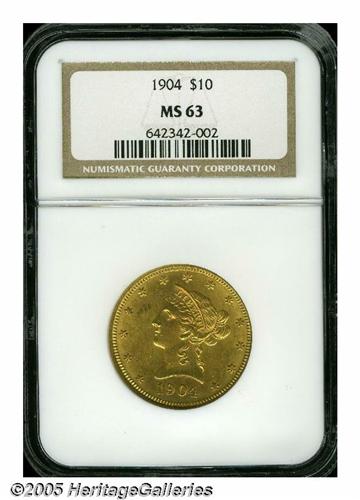 <B>1904<$10> MS63 NGC.</B></I> An attentively struck and lustrous Liberty Ten. The cheek is undisturbed, and the obverse field has only faint grazes. A scarcer date at the Select level.