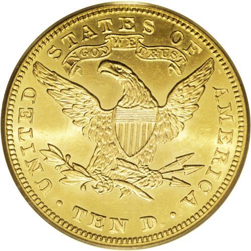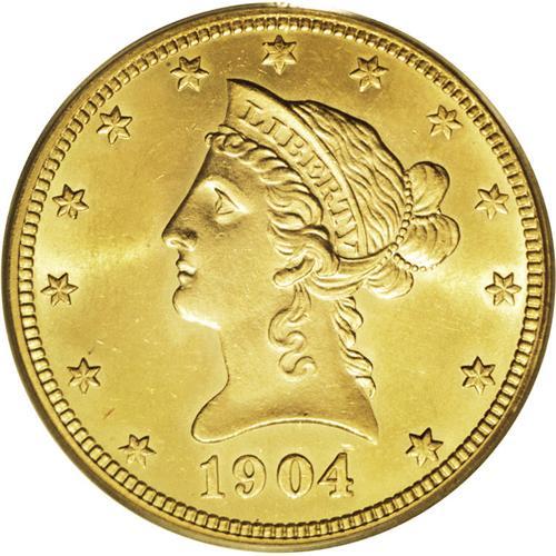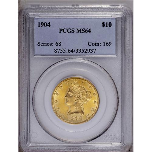 <B>1904<$10> MS64 PCGS.</B></I> A dazzling lemon-gold near-Gem with clean surfaces and imposing eye appeal. Only the final star is not fully impressed. At the MS64 level a much better date, courtesy of a relatively low production. The Philadelphia Mint apparently concentrated on double eagles in 1904. Population: 27 in 64, 2 finer (2/06).