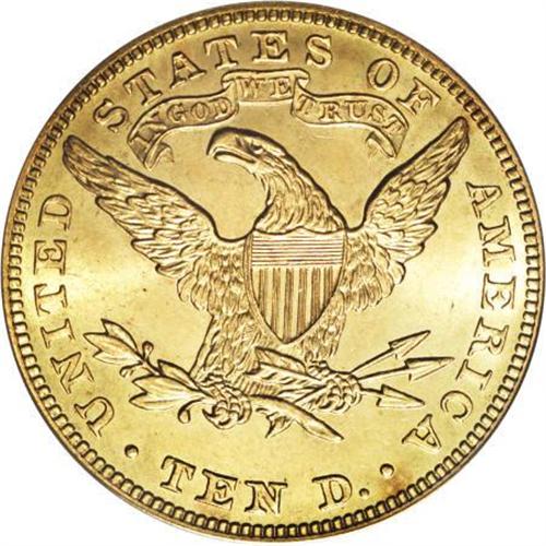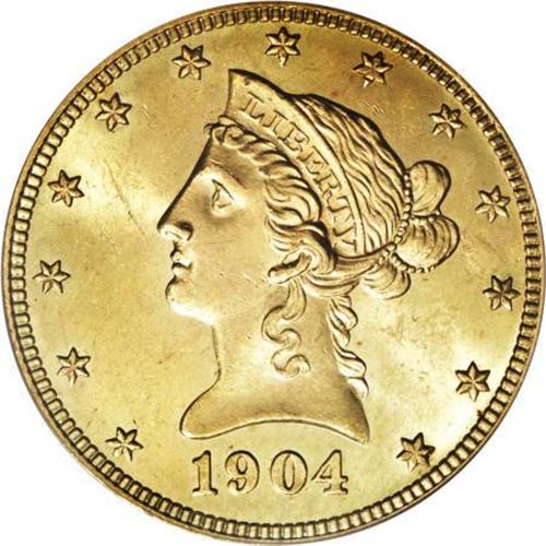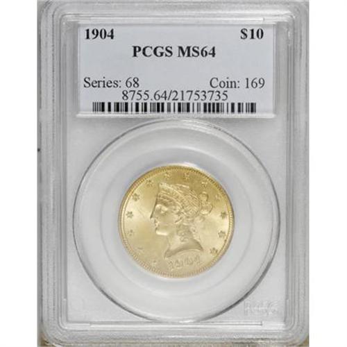 <B>1904 $10 MS64 PCGS.</B></I> A shimmering lemon-gold near-Gem with smooth surfaces and considerable eye appeal. Fully detailed except for the star to the right of the date. At the MS64 level this issue is a much better date as Philadelphia's mint apparently concentrated on double eagle production in 1904 at the expense of the coining of tens. Population: 28 in 64, 2 finer (11/07).<BR><BR><B>Coin Engraver:</B> Christian Gobrecht<BR><BR><b>Shipping:</b> Coins & Currency (<a target="_blank" href="http://www.heritageauctions.com/common/shipping.php">view shipping information</a>)