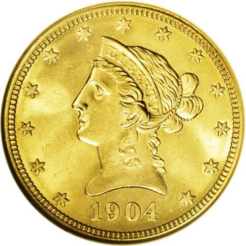<B>1904<$10> MS65 NGC.</B></I> This is a sharply struck and highly attractive Gem with excellent surfaces. The mintage of this issue is surprisingly low with a mere 161,930 coins produced. There is no doubt that the biggest need in commerce at the time was the larger double eagle, which soared to a production of over 6 million coins, the second highest mintage of any gold piece of that denomination. This piece has deep honey-gold luster with greenish tendencies. The surfaces are pristine with few blemishes of any kind. Census: 2 in 65, 2 finer (9/06).