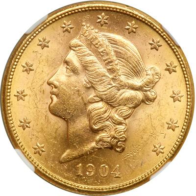 1904 $10. NGC graded MS-62. Attractive subtle golden coloration can be seen on both sides, luster fresh and satin-like.