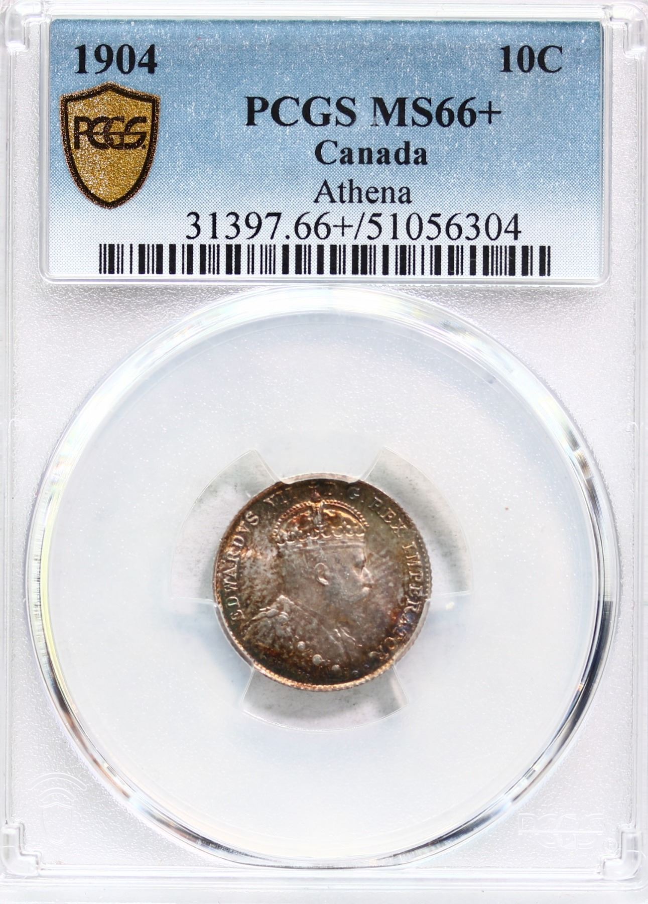 1904 10¢ PCGS Superb Gem Mint State-66+. Light autumn shades over full underlying lustre. Wow! Not often offered in this condition, a highly attractive and beautiful example to add to the best of collections. A must see!