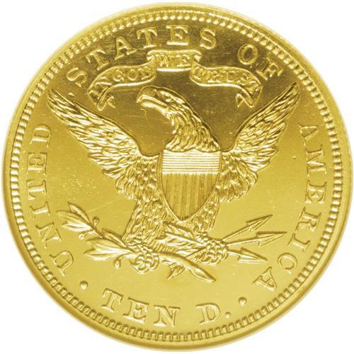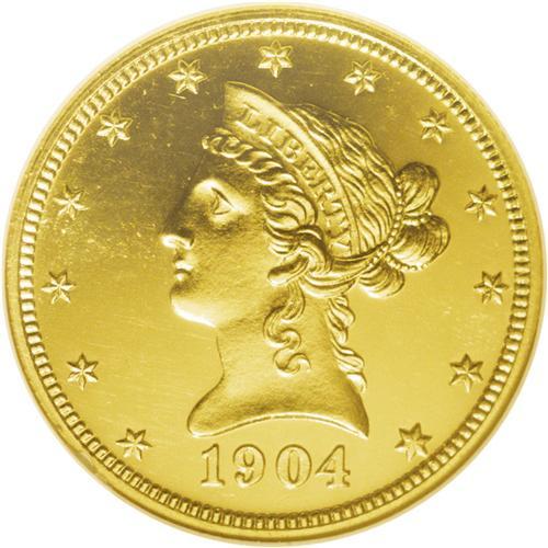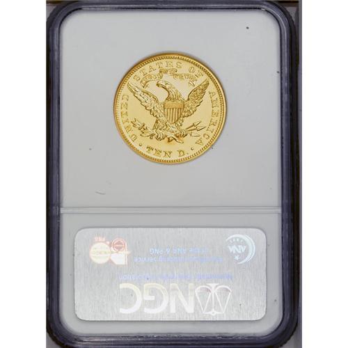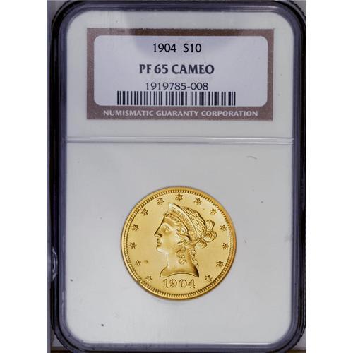 <B>1904<$10> PR65 Cameo NGC.</B></I> Although 108 proof pieces are recorded, this issue appears to have survived in lower proportions than some other proof dates with comparable mintages. This delectable example offers lush, lemon-gold surfaces that are undisturbed by mentionable impairments of any kind. The frosted surfaces contrast starkly with the deeply mirrored, black-on-white fields. Breen's proof <I>Encyclopedia</B></I> comments tersely of this issue, "rare Choice." A die line within the curl below the ear, near the top of the neck, is a diagnostic for this rare proof issue. There is a small spot of grayish toning near star 2. NGC has graded only four Cameo Gems of this date, with three Cameo-designated pieces finer (7/06).